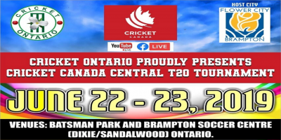 Cricket Ontario is pleased to announce the hosting of Cricket Canada Central T20 tournament on June 22nd and June 23rd at Batsman Park and Dixie Sandalwood Park in Brampton, Ontario. Five (5) Ontario teams Toronto District Cricket League Select, Brampton Etobicoke District Cricket League, Ontario East Region Select, Ontario West Region Select and Ontario U23 teams will take part along with National U19 Team and Manitoba and Quebec provincial teams will take part.